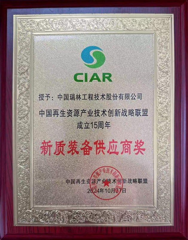 10月27日,2024固廢資源化創(chuàng)新與綠色發(fā)展峰會暨中國再生資源產業(yè)技術創(chuàng)新戰(zhàn)略聯(lián)盟成立15周年大會在天津舉行。會上,聯(lián)盟向為我國再生資源產業(yè)科技創(chuàng)新與發(fā)展作出杰出貢獻的企業(yè)與個人頒發(fā)了獎牌和榮譽證書,中國瑞林被授予新質裝備供應商獎,中國工程院院士、中國瑞林副總工程師張文海、副總工程師葉逢春,以執(zhí)著、求真、務實的科學精神及其在技術研究領域的成就,分別獲“終生成就獎”和“卓越貢獻獎”。