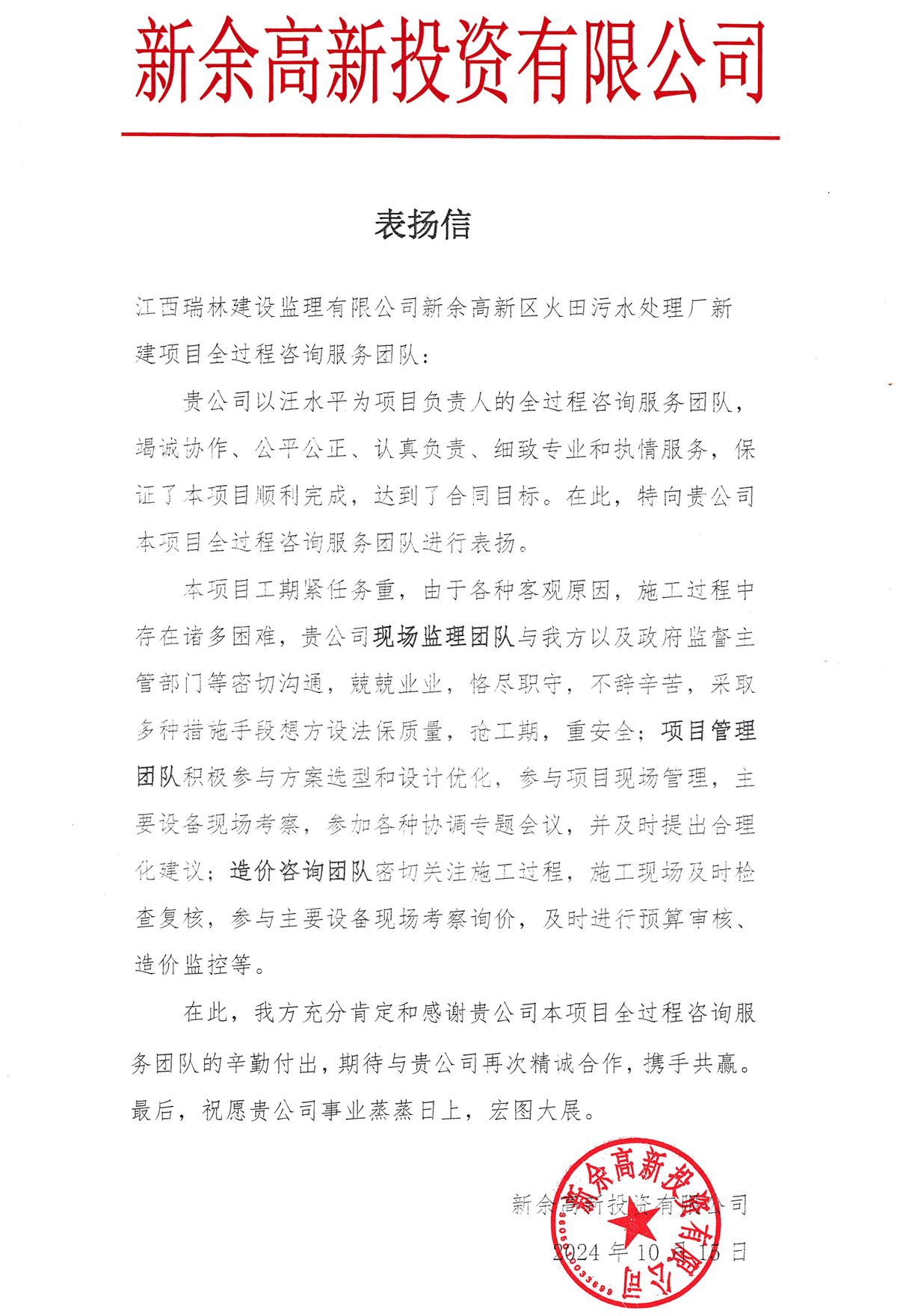 近日,中國瑞林全資子公司江西瑞林建設(shè)監(jiān)理有限公司承接的新余高新區(qū)火田污水處理廠新建項目一期全過程咨詢項目順利通過竣工驗收。業(yè)主也發(fā)來表揚信,感謝公司項目團隊為項目所作的貢獻。